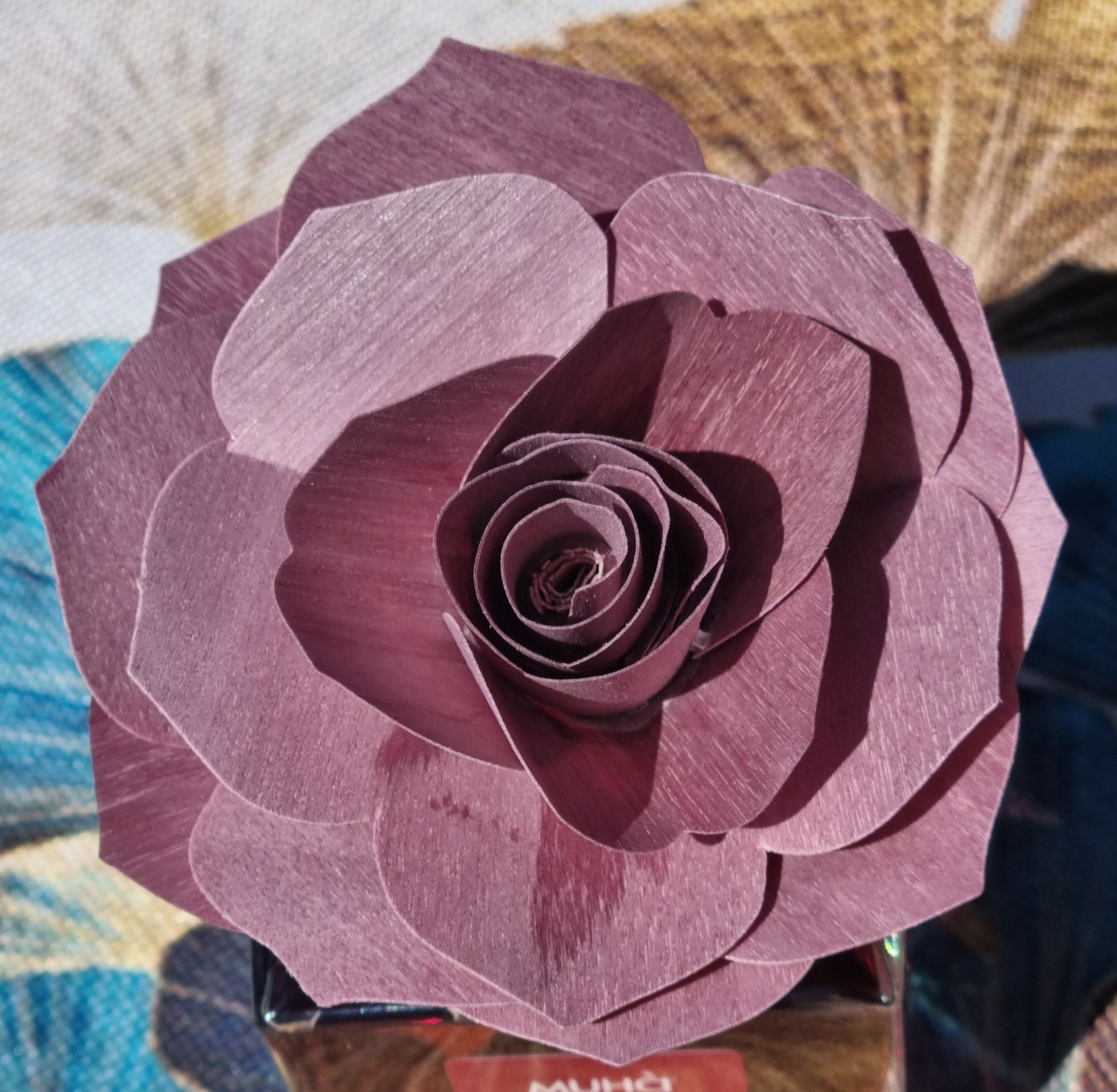 Profumatore d' ambiente con diffusore a forma di rosa in legno di betulla realizzato completamente a mano. Completo di pipetta contagocce per prelevare del profumo da mettere sui petali per un profumo più intenso.