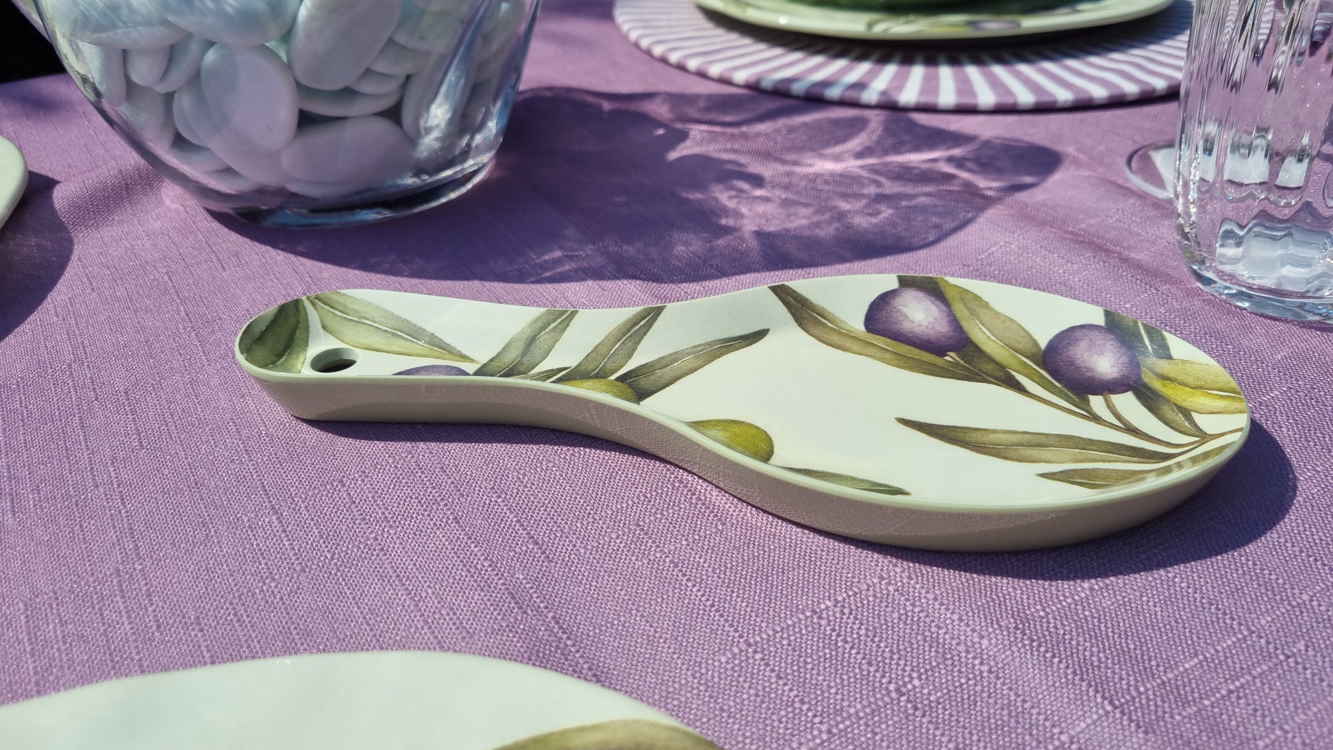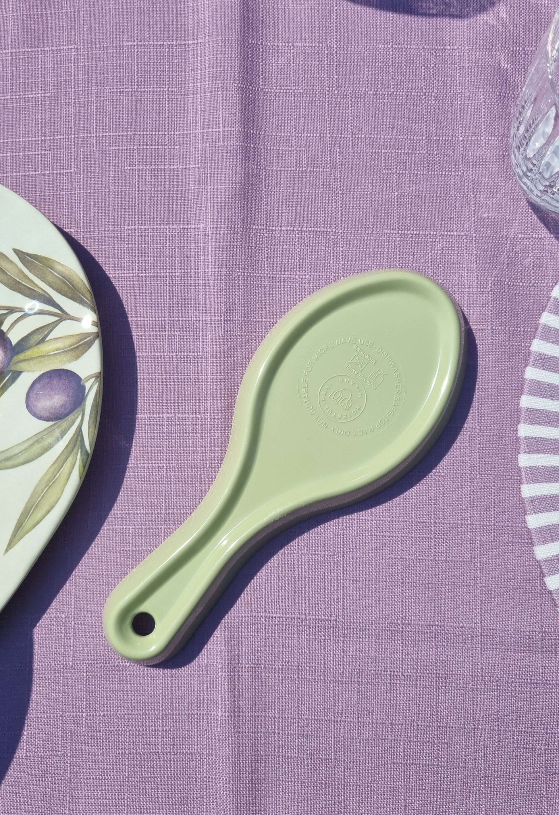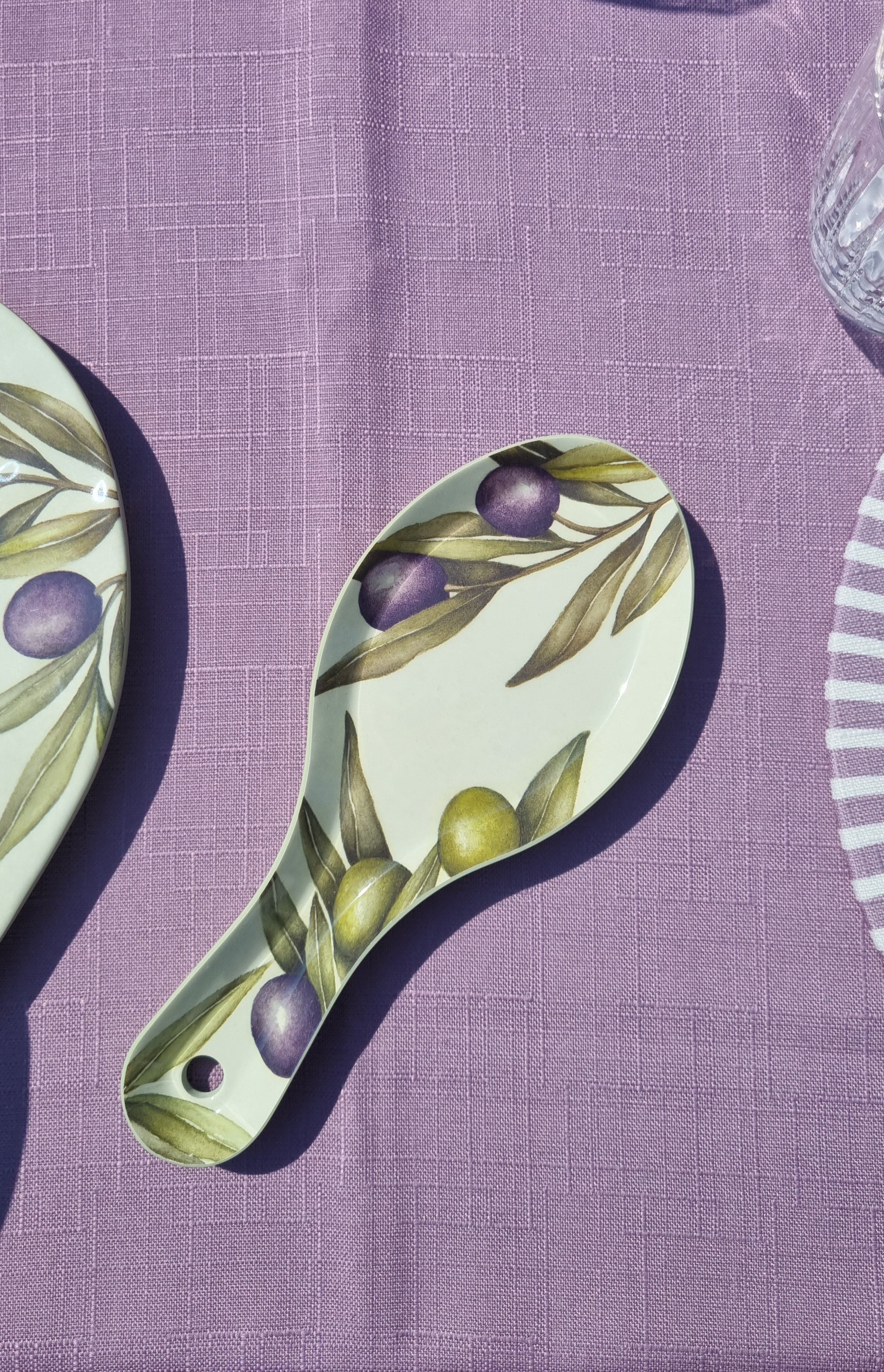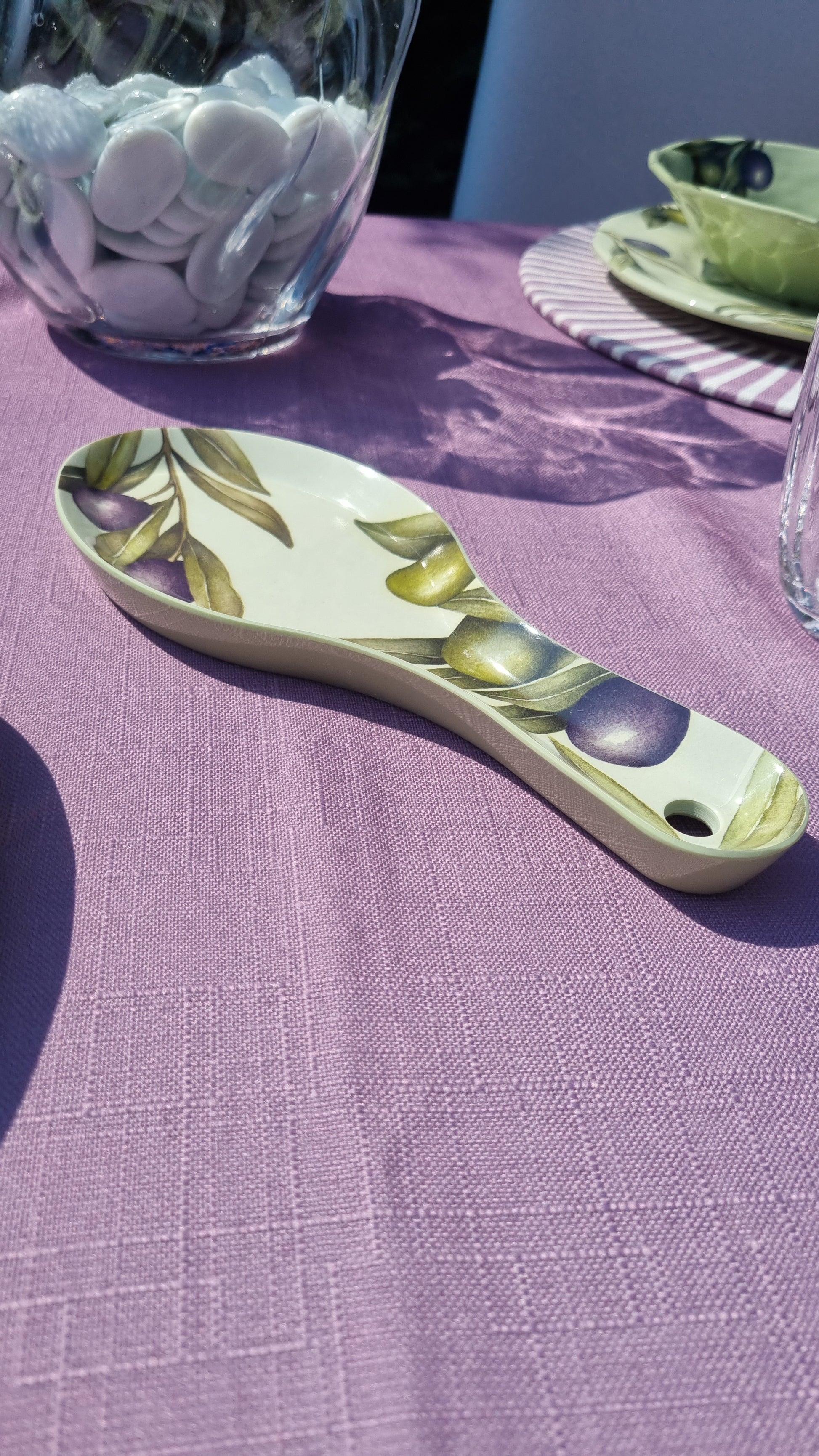 Poggiamestolo in melamina, dalle caratteristiche di un materiale leggerissimo, pratico e praticamente infrangibile. Collezione Olyvia, la fantasia riporta un acquerello realizzato a mano dell'ulivo, iconico soggetto che riporta al sapore del Mediterraneo.
