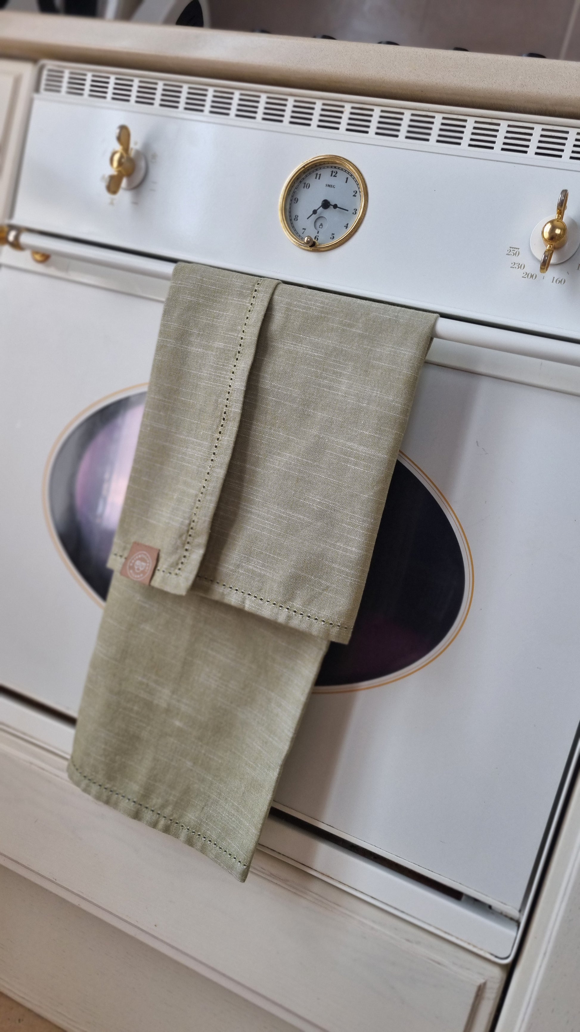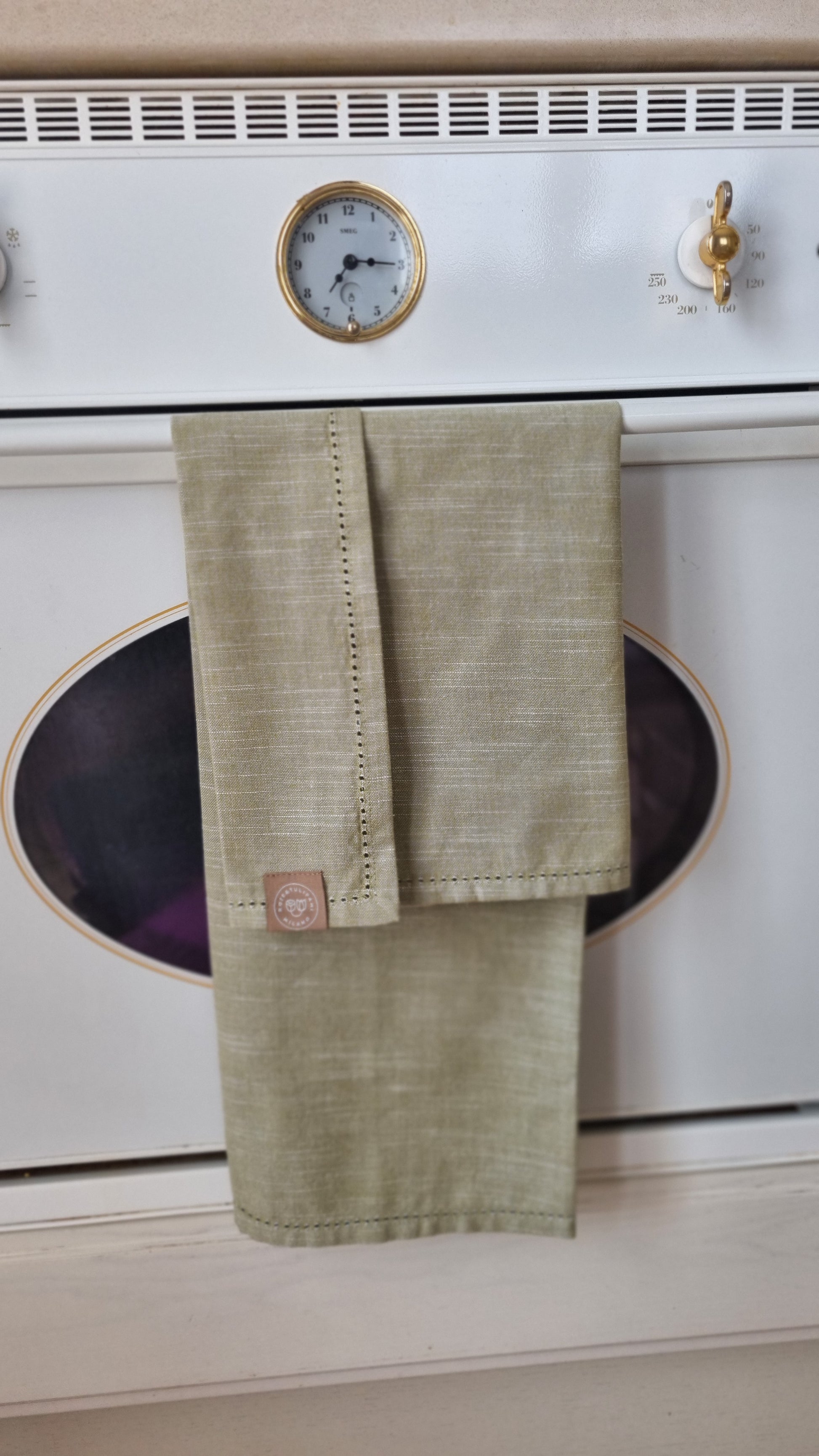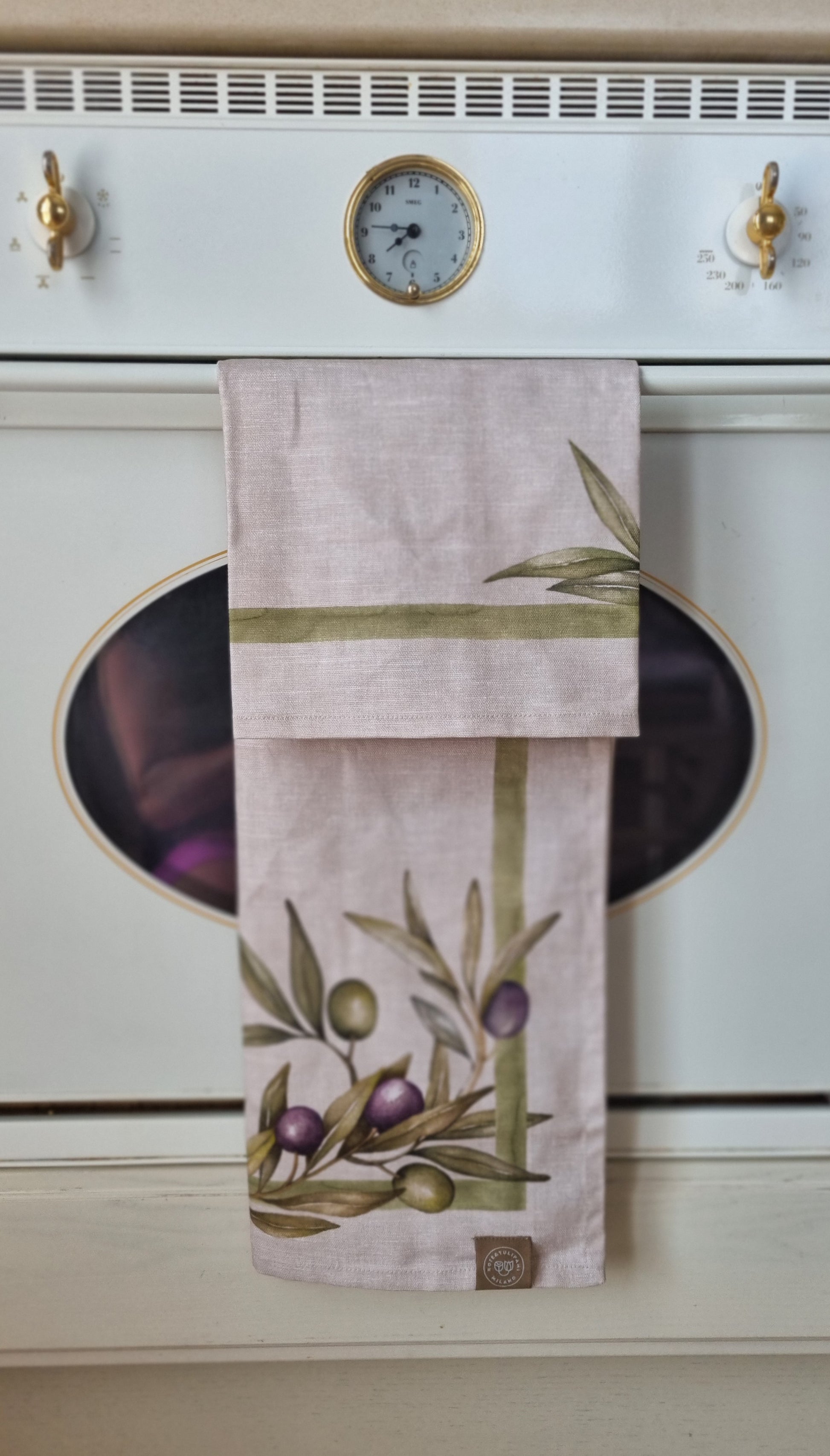 2 Canovacci in 100% cotone: uno in tinta unita color verde Oliva con bordo ricamato, uno beige chiaro con cornice verde e fantasia ulivo. Completi di fettuccina sul retro per appenderli.