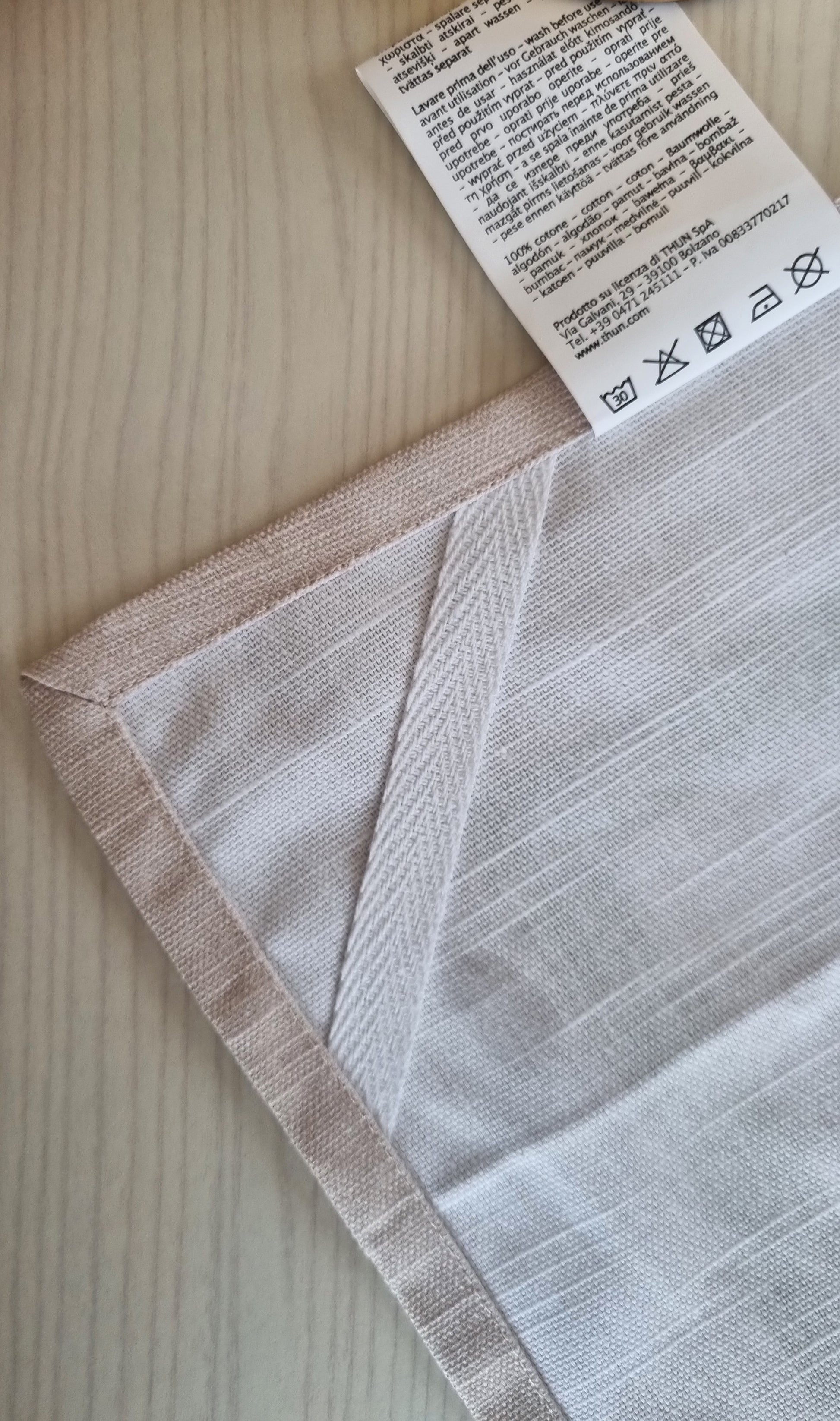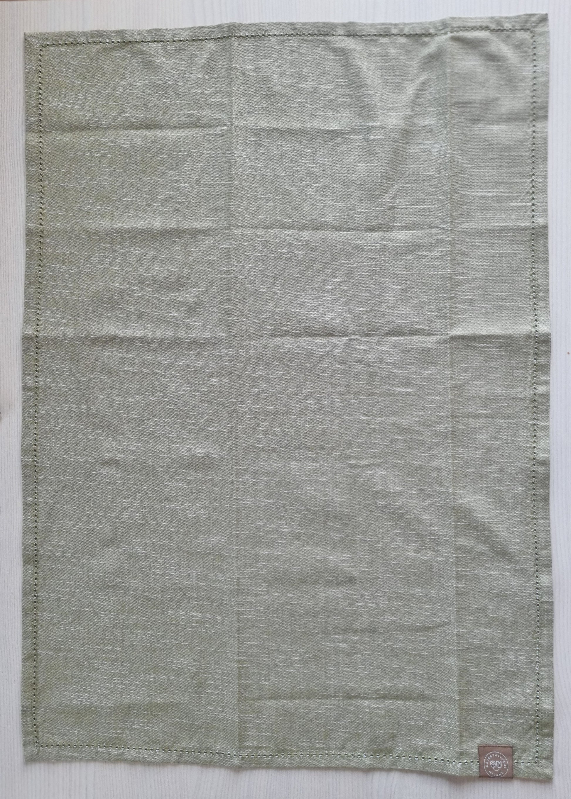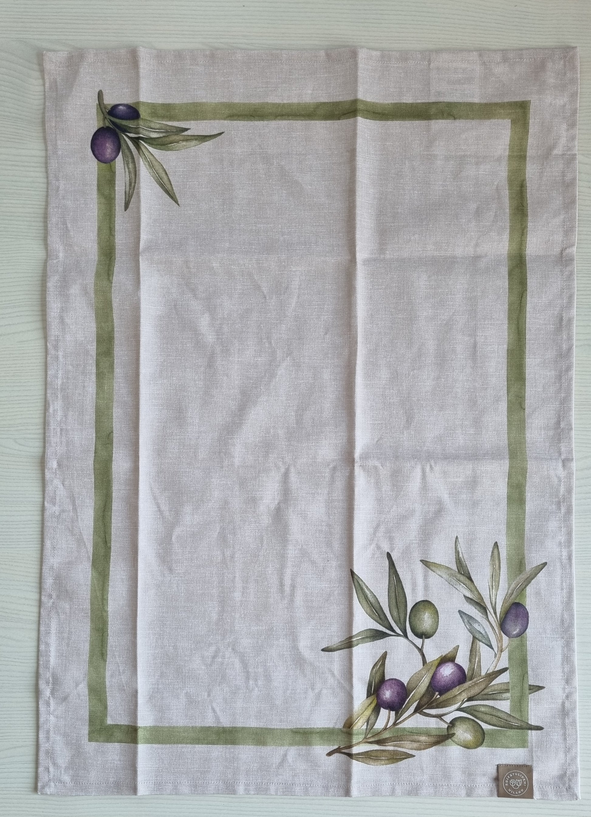 2 Canovacci in 100% cotone: uno in tinta unita color verde Oliva con bordo ricamato, uno beige chiaro con cornice verde e fantasia ulivo. Completi di fettuccina sul retro per appenderli.